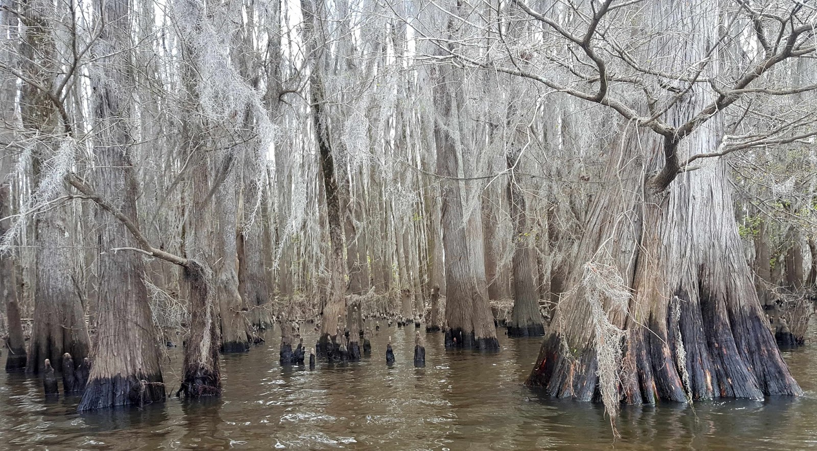 We had missed the narrow opening into M-M lane, also known as Starr Ditch. The cloudy skies and the Spanish-moss-draped trees give a Halloween feel to this lane. We read later that these are old cypress trees in Caddo Lake. Even though they love the moisture, a cypress seed can't germinate and sprout in the water. So these trees started before the natural dam flooded this area into a lake.