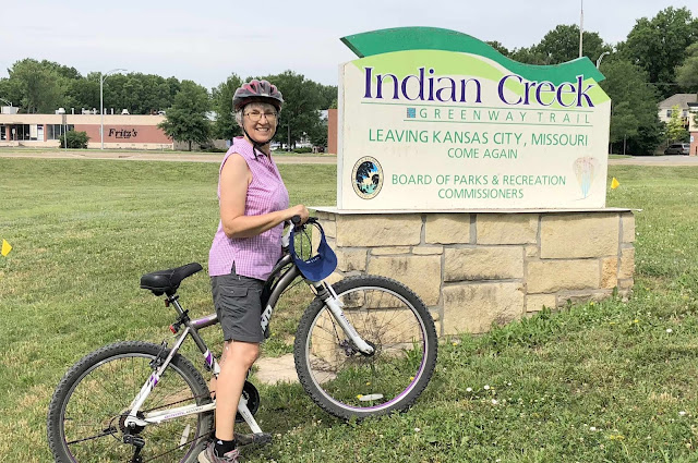 This day we rode all the way to another state! We had ridden seven miles when we hit the Kansas/Missouri state line. Then our trail became more urban, so we turned around to pedal back towards the car.