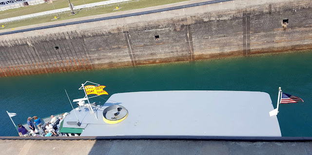 Before we proceed with lots of pictures of ships, it's time for a rant. Traveling far and wide, we have to learn how to pronounce new town names all the time. We found out that this new-to-us city of Sault Ste. Marie is pronounced "Sue Saint Marie." We must point out that the famous Soo Locks found here are also pronounced "Sue." A couple months ago we were in South Dakota, where they decided to spell "Sue" as Sioux. Can you believe that words that are spelled so differently (Sault, Soo and Sioux) are all pronounced the same? Can't we all just agree on one spelling so it doesn't confuse the tourists?