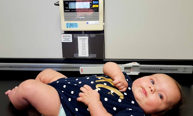 She's weighing in at a healthy 14.2 pounds at Dad's office baby scale.