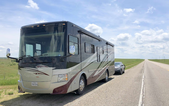 As the hours stretched on, we ate lunch. That's another good thing about being stranded on the side of the road for hours in a motor home--we had plenty of food. Denisa called our extended warranty company, alerting them that we would have a claim soon. Mark talked to the repair shop in Fort Pierre, and they recommended a tow service that coach-net is sending our way. Even though we are in the middle of nowhere, it is quite lovely as we look out our window.