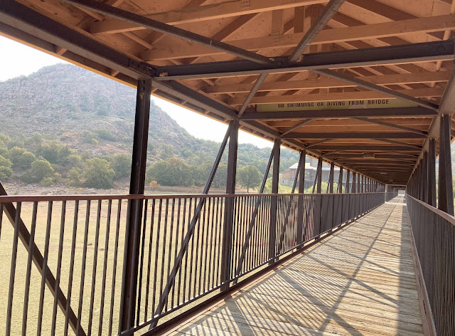 We walked all the way to the end of the trail, crossing the pedestrian bridge close to the lodge. Can you read the warning on the bridge?