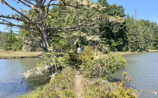 Since we were up so early this morning, we have plenty of time to do some exploring outside of our favorite town of Bandon. So we are heading north up the back roads along the coast for a hike at the National Estuary Research Reserve. Estuary is a fancy term for where the fresh water river meets the salt water ocean. With all that water meeting, the plants are lush and green on this trail.