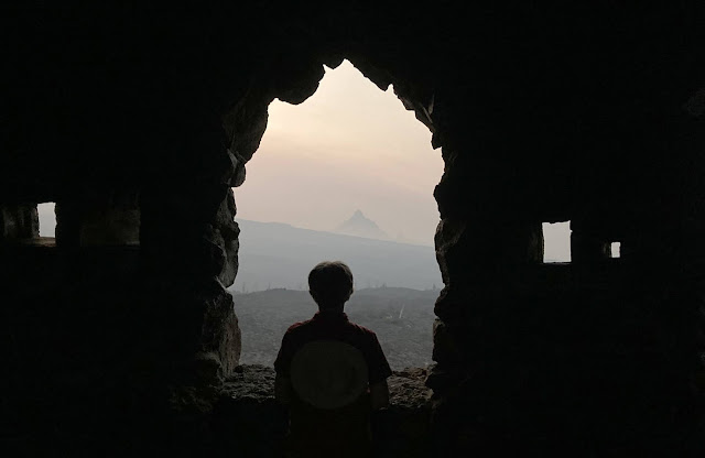 We had hoped to get good views of "The Three Sisters"--three volcanic mountains that are the namesake for the town of Sisters, Oregon, that we drove through at the start of our day today. But the sisters are shy this evening, not showing their faces through the smoky haze.