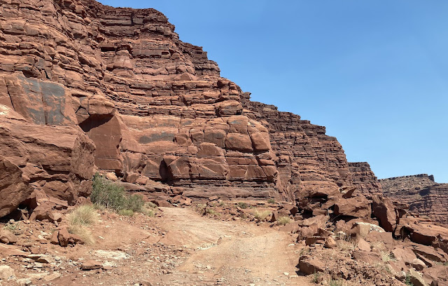 But we didn't have a permit. So we are traveling on the straighter Potash Road that eventually heads back towards the town of Moab. The scenery at the bottom of this canyon is beautiful!