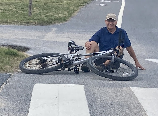 So in answer to the question of "What does Mark have in common with Joe Biden?" the answer is that he also laid his bike down at this cross walk in Rehoboth Beach, Delaware. Of course, instead of falling off it, Mark gently laid his bike down and then crawled under it. But the pose is very similar.