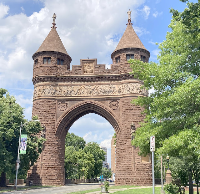This is a very nice walking park, scattered with statues and memorials. We especially like this grand-sized Soldiers and Sailors Memorial Arch over Trinity Street in the park.