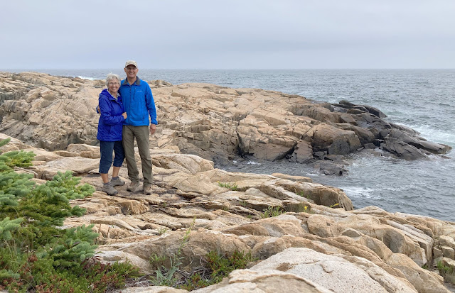 We finally got out of the motor home around noon. Because we had expected company, about a month ago we had purchased a reservation to drive up to the top of Cadillac Mountain in Acadia National Park. This park is crazy busy in the summer, and this is the highest point with great views of the ocean and the surrounding mountains. Everyone wants to make that drive up Cadillac Mountain, and the parking lot at the top isn't very big. So the national park has severely restricted the number of people allowed on the road. You have to make the reservation far in advance with no idea what the weather would be like. We went ahead and drove to the top of Cadillac Mountain at our reserved time. The gate keeper must have thought we were crazy--and we were. The reservation is for a specific time to enter the road at the bottom of the mountain, but you can stay as long as you would like at the top. We brought our computers and tried to wait out the rain for the view. But after three hours on top of Cadillac Mountain, this was the best view we got--and we had to get really wet to take this picture.