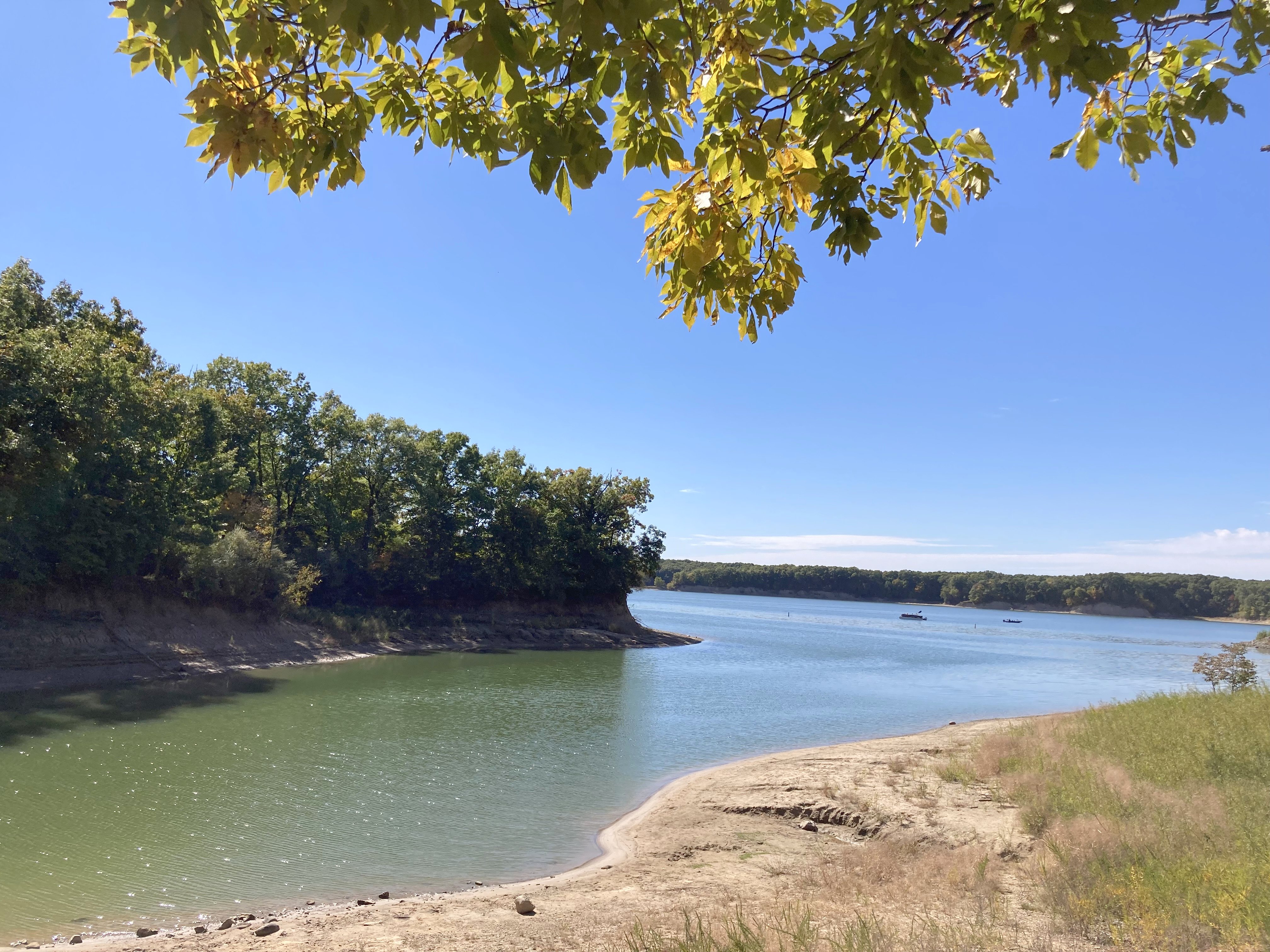 Back at our campground, we can see the lake from the motor home. We watched as one of the resident deer walked along the lake shore.