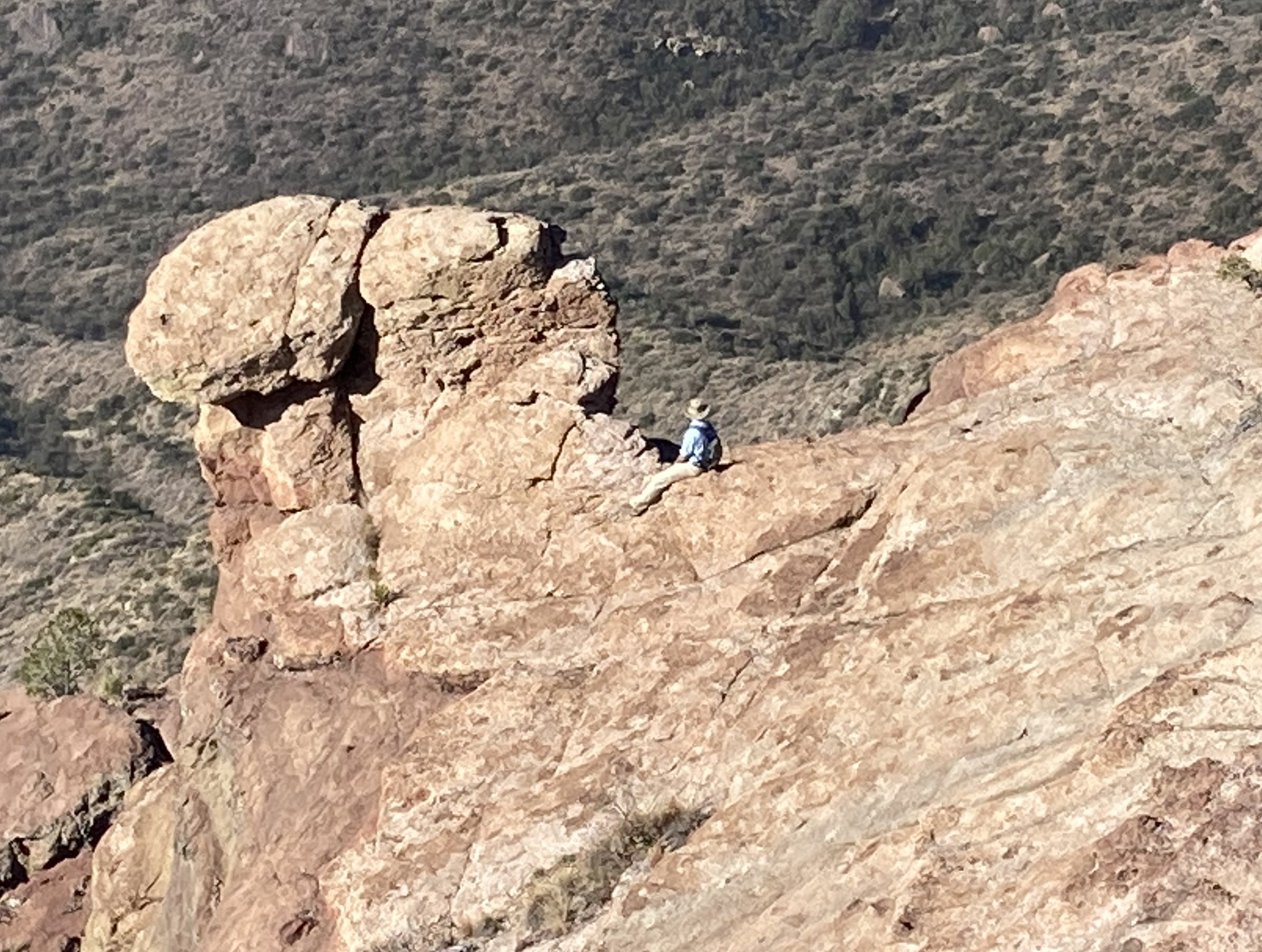 It took some rock scrambling, but he managed to make that climb. He enjoys standing right by that tall rock column that no one else would consider exploring. Turns out that it was bigger than it looked from a distance, because you can barely see Mark standing in the "palm."