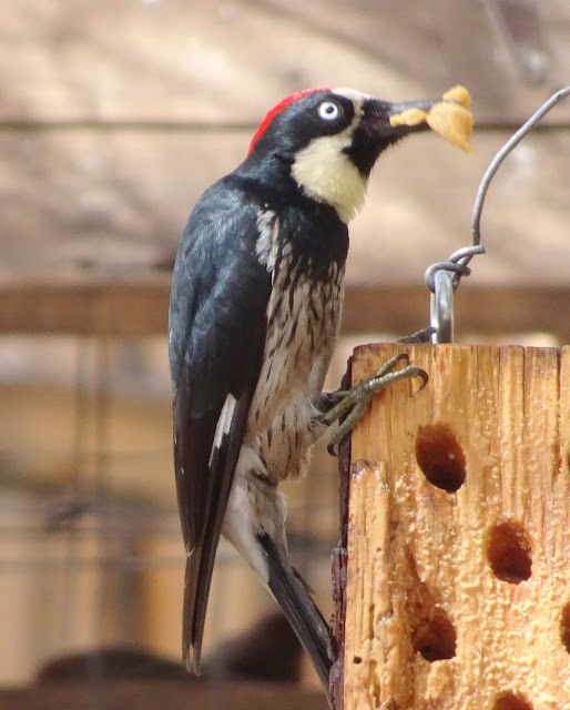A new electrical pole had been placed in the state park, and this acorn woodpecker was working to make it into a new granary.