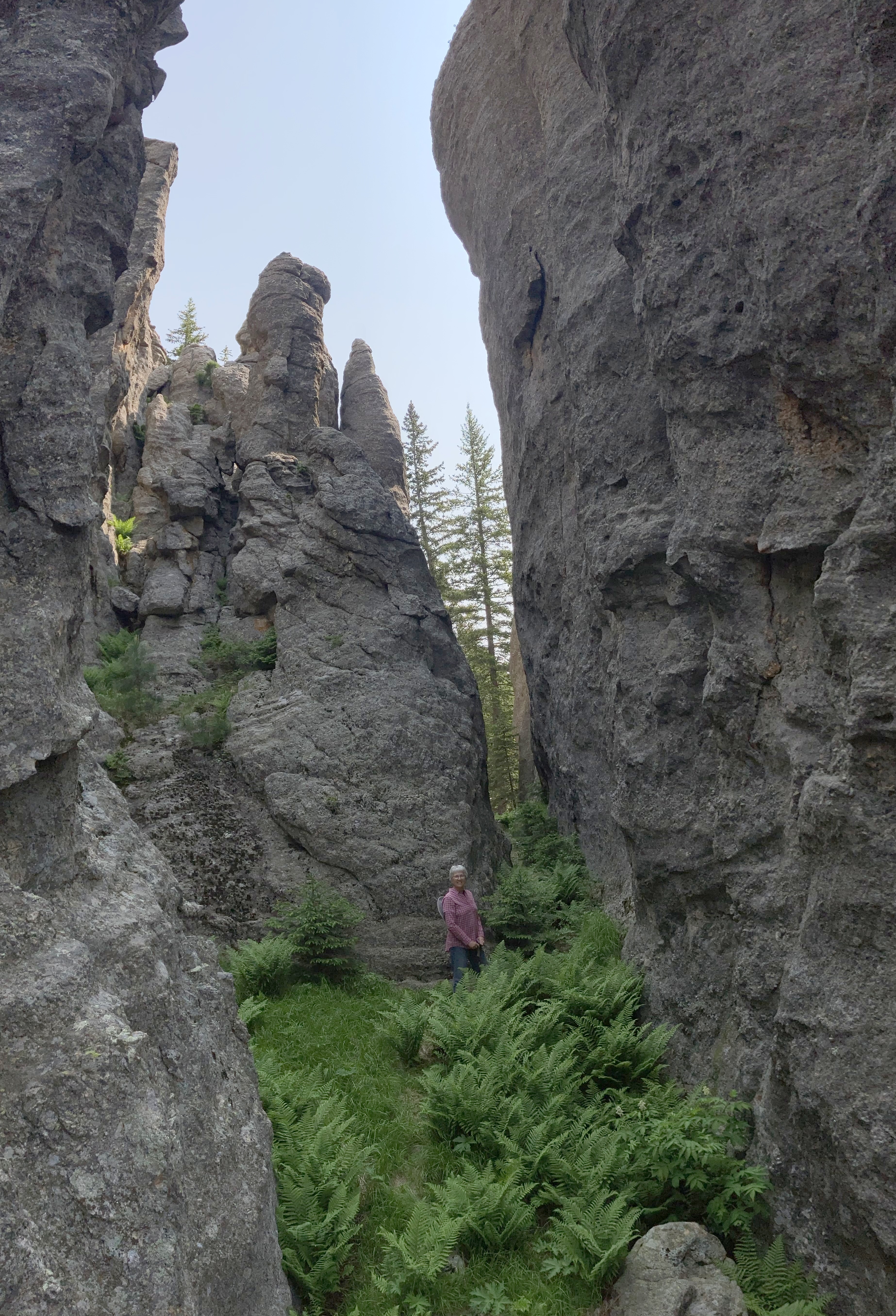 While we have seen the Cathedral Spires from the distance, it was even more fun to hike between them. Denisa is on the trail, with those tall granite spires on both sides of her.
