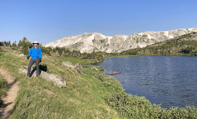 Here's a hint: Most of the time our hikes include just one lake. We've been known to go on a 15-mile hike just to see one mountain lake. But here was Mark at 8:00, standing beside our second lake. It was still cold (as you can see that Mark was wearing his normal July wardrobe of a coat and gloves).