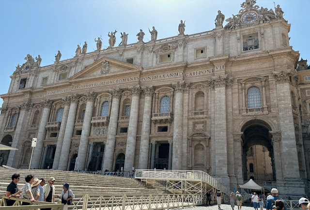 We think that the Vatican and the Basilica are crowded every day of the summer. But we managed to be here on an especially busy day. Tomorrow is St. Peter's Day, and no tours will be allowed. So they had to jam two days of tourists into one day. Chairs were set up inside and outside for the special services that will be held tomorrow for the festival.