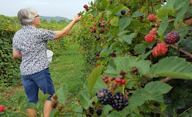 From doing some taste-testing right off the vine, she has determined that the best berries are those that are almost black. The red ones are too sour and the black ones fall apart when they are picked. The ones in the middle are just right.